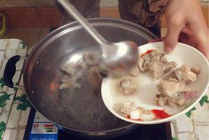 排骨放锅里煮,同时放入干香菇,姜,葱(因为我不喜欢生葱味道,但烧菜又得放,所以早早放进去,待会再把它捞出来扔掉),倒入适量料酒