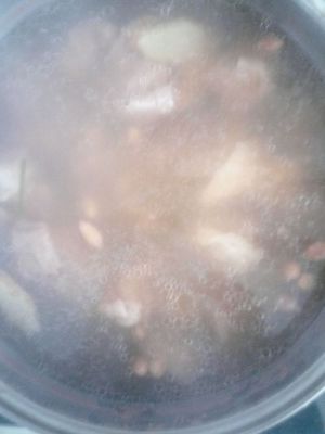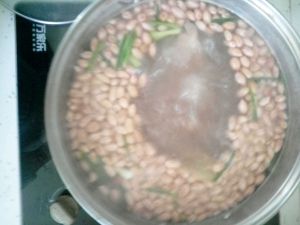 因为花生也不是特容易熟的材料,所以在排骨第一遍开锅的时候就放入花生一起煮。煮开了就可以调小火慢慢炖着了~