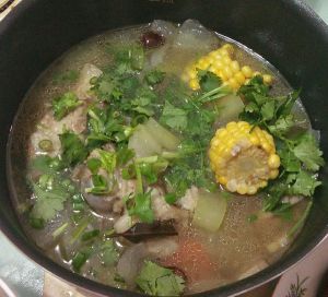 骨头、姜片、葱段(可不放)、料酒少量放汤锅里,加开水,大火煮开,小火慢炖;大概煮一个小时左右可以下除了冬瓜外的其他食材;再煮30分钟下冬瓜,煮20分钟就好了