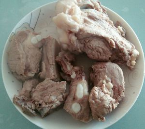 骨头冷水下锅不盖锅盖焯水,水沸后煮两分钟把血水煮出去,捞出用热水将浮沫冲干净
