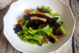 材料:西蓝花切片,蒜拍碎,猪肉切丝,胡萝卜切片,木耳