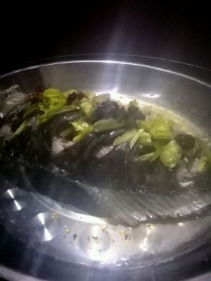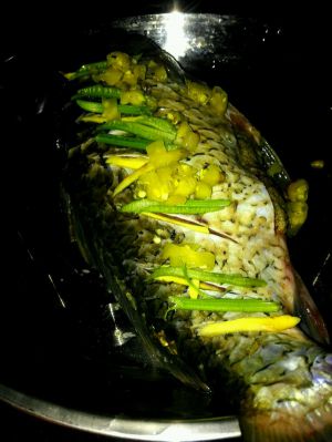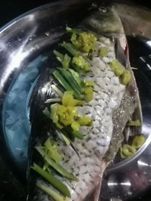 蒸锅放水。等水开了。再把鱼放到上面去蒸。整个十分钟到十五分钟就好。蒸完大概是这个样子的。手机拍不清。因为是大晚上的。又有蒸汽环绕。