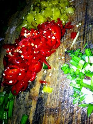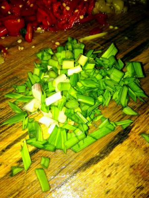 准备配料了。剁辣椒。红辣椒。姜。大蒜。芹菜。(我无聊加进去的。这个也是可以去腥味的)