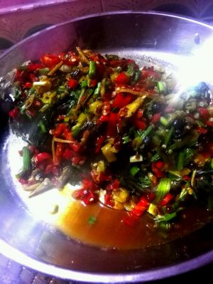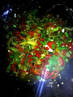 锅内放油。等油热了。依次放入姜丝。剁辣椒。红辣椒。芹菜根。炒炒炒。大蒜最后放。中途我喜欢把蒸鱼出的汤汁倒在锅内一起炒。对了我还在里面加了一个宝贝东西→_→野山椒豆鼓。哈哈。很辣。但是放了绝对好吃。炒完大概就是上面那个样子。对了。快好的时候记得放盐。酱油。鸡精。