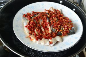 自制的剁椒酱,放上蒜粒、白砂糖拌匀,铺在鱼身上,放热水里蒸制10分钟。