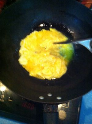 锅中多放油,下入鸡蛋炒鼓起来,然后马上盛出备用,不要炒老了