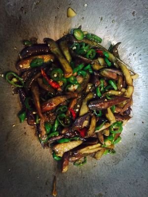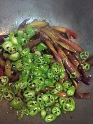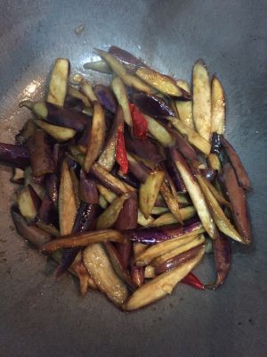倒油 一般的量即可 蒜干辣椒爆香 放茄子 不断翻炒