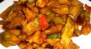 锅中留少许油 放入鸡酱 清水适量 淀粉适量 放入茄子收汁即可