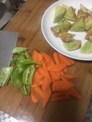 茄子去皮切块,尽量大小差不多,尖椒切块,胡萝卜去皮切片。