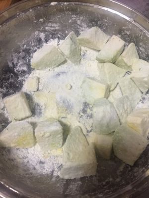 茄子放盆里加入淀粉,再加入少量食用油、少许水拌匀。如图片这样挂满糊。