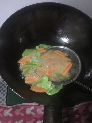 把切好的胡萝卜和尖椒也炸一下
