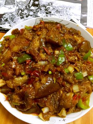 锅内热油:放茄子炒一会,茄子发软放酱油,炒几下放豆瓣酱,(不喜欢吃辣可以放甜面酱)翻炒两下倒入清水,大火焖一会。汤汁快没的时候放青椒翻炒(不喜欢吃辣可以不放)最后放鸡精 放葱。OK了