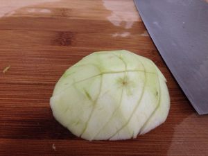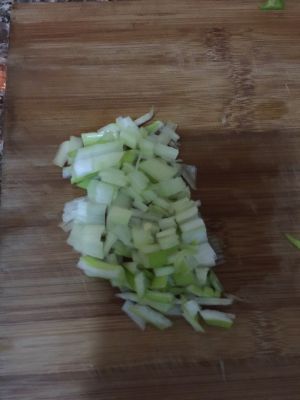 备料:先准备茄子洗净,切滚刀小块,青椒去籽切小块。适量葱切好备用。(茄子切好后放大碗里然后放盐。等过一会把盐水倒出去,这样茄子好炒。)
