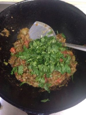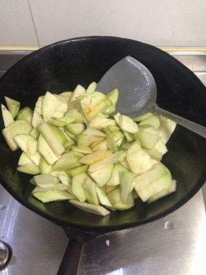 放入茄子大火翻炒,随后放入1/2的盐,转中小火继续翻炒至茄子软烂。