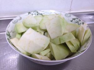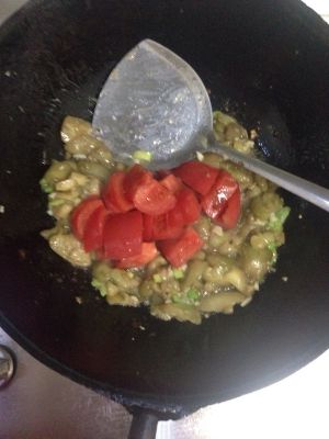 茄子一根削皮切滚刀块,上锅倒油,油热放茄子(材料上写的油挺多,其实根据锅大小,我用的小锅有弧度觉得省油,土豪用平底锅,随意就好)