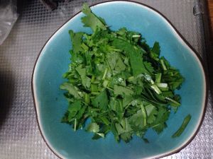 茄子滚刀块切好,加少许盐腌制,10分钟左右把腌制好的茄子挤干水分。待用。