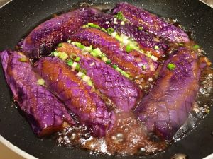 过滤过多余的油以后重新将茄子放回锅内,一次性倒入生抽、黄酒、糖、醋,喜欢甜一点的就多放点糖,喜欢酸点的话醋的量可以增加,直到调成自己喜欢的味道加一点点的水,撒上葱花盖上盖子,闷烧两分钟后撒入蒜片,再把汤汁开大火收到浓稠就可以了,如果不够咸,记得撒盐调味哦!