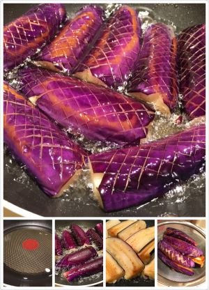 取一口锅倒入稍多的油,开中火慢慢烧热到170度左右,下茄子开始煎了,先将白肉部分朝下煎至金黄色,再翻面将皮朝下煎1分钟左右,中途可以翻起来看看茄子皮颜色是不是已经达到你要的颜色,只要茄子皮不能发暗,整片茄子已经煎透即可倒入漏勺内过滤掉多余的油。