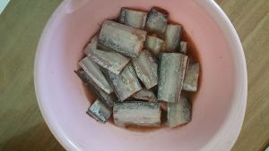 带鱼清洗干净,去掉内脏,加入少许料酒和盐腌制;