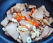 锅里放五花肉煸香,煸出油后,放入姜蒜,花椒,辣椒,炒出香味。