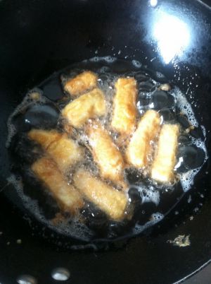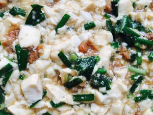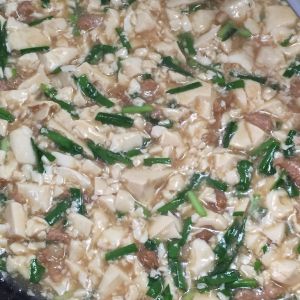 豆腐煮开后,加入芡汁。芡汁由盐,酱油,水淀粉做成,其实同腌肉沫的用料差不多。