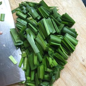 看到芡汁开始浓稠后,加人腌好的肉沫,接着放韭菜。