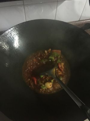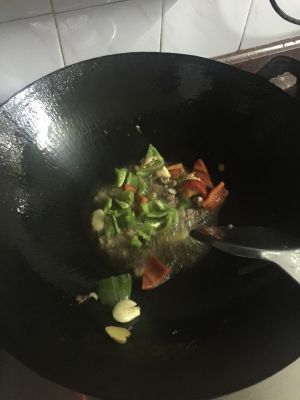 放入姜片大蒜爆香,再放入剁好的瘦肉翻炒