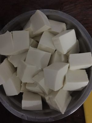 锅内加适量水,煮开,放油然后下豆腐。豆腐可以用锅铲直接在锅里切成小块。