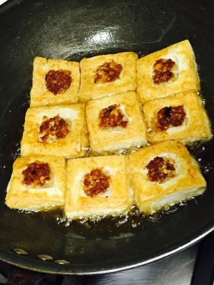 将酿好的豆腐放入平底锅稍微煎一煎,塞肉泥一面要注意煎熟