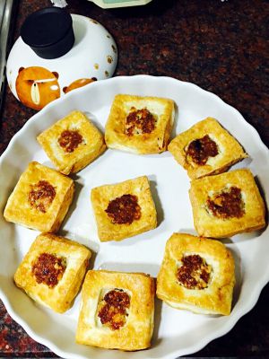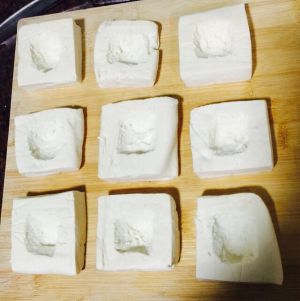 豆腐切块,中间挖洞备用。我这个切的有点难看