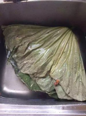 拿出后荷叶包好 用毛线缠紧 上蒸锅蒸40分钟