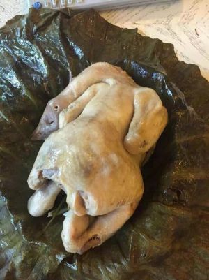 预热160度, 中下层, 烤80分钟,. 敲开面皮,揭去荷叶,美味的叫花鸡就摆在眼前;敲开面皮,.揭去荷叶;