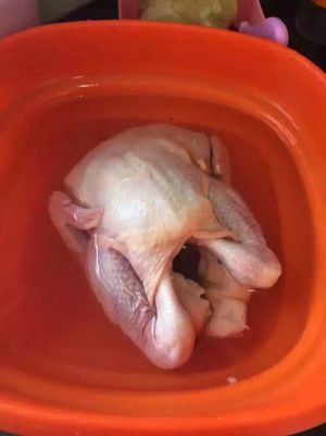 三黄鸡 拍打完盐和酒 再拍点海鲜酱油 然后将姜片 葱结 香菇塞入鸡腹内 用保鲜袋包起来 冰箱冷藏一晚