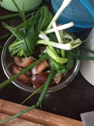 将混合好的香菇丝和洋葱丝, 姜, 蒜等其他调料塞入鸡腹中;