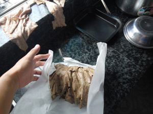 用白酒将面粉和匀备用(用擀面杖擀成长方形),用锡纸把腌制好的鸡包好;用牙签在上面扎几个小洞,最后在用刚才和的面包在锡纸外面(记住,面粉包时千万不能封口)。把没有封口的那面朝下放,放在烤盘上