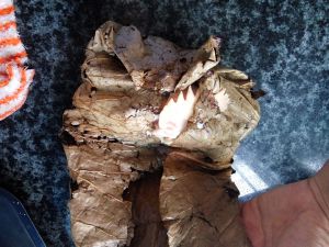 泡软的香菇一个切成四块,过油爆香,放凉,待腌制好的鸡,放入鸡腹中!泡软的荷叶将鸡包住。