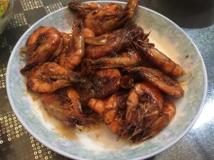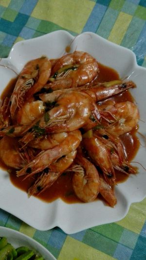 虾剪须挑背后,下油锅至变色,捞出待用。原油锅加入一袋番茄酱,炒开后把刚才的虾重新放入锅中,加入,调好的姜丝葱丝料酒老抽红糖,翻炒入味。