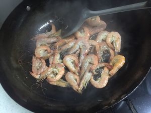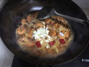 锅里放入平时炒菜的油量,油热后把虾倒入,翻炒至虾体变红!随后放入葱姜蒜,同时用炒勺使劲挤压虾头,把里面的虾油挤出来。一勺料酒,一勺酱油,半勺醋,适量的盐和糖,翻炒。我还稍微放了一点鲍鱼汁,嘻嘻!之后放入水,我觉得跟虾一般多的话,汤就多,虾的一半我觉得应该差不多,最好是热水,改小火盖盖,焖一会儿,三分钟那样,收汁儿,起锅,哈哈