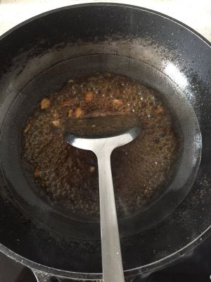油热后下蒜炒香再把调好的蚝油汁倒入,立刻沸腾了,关火