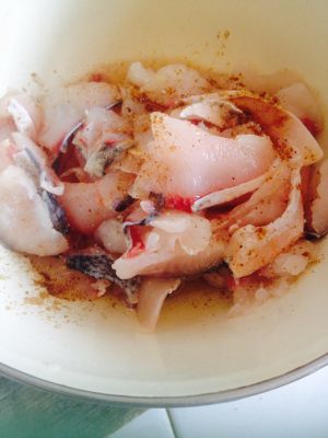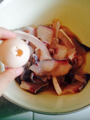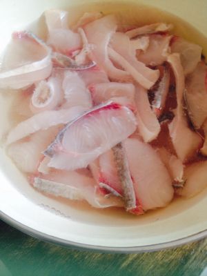 剔鱼骨,鱼肉切片,用鸡蛋清,淀粉,盐,花椒粉,胡椒粉,料酒腌20分钟