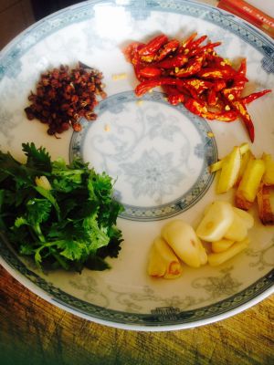 准备 葱 姜 蒜 小米辣 全部切沫 ,干辣椒切段