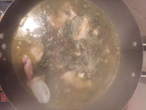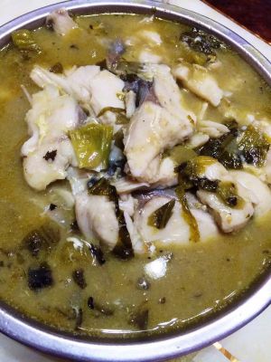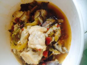 煮鱼汤, 锅里倒油,葱姜蒜炒香,放入切碎的酸菜,小米辣,加水,水烧开放入鱼骨,炖20分钟,别忘了放盐,水开后尝一下