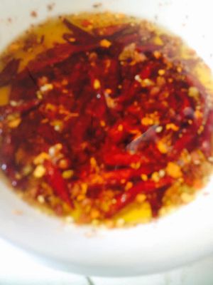 锅中放油 3分热时 加花椒 干辣椒 炒香“要小火噢” 碗中放上芝麻 把炒好的辣椒倒入装有芝麻的碗中 炒了辣椒的油 留一半 炒酸菜