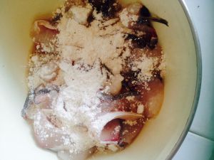 把沥干的鱼片倒入碗中 加 盐 五香粉 料酒