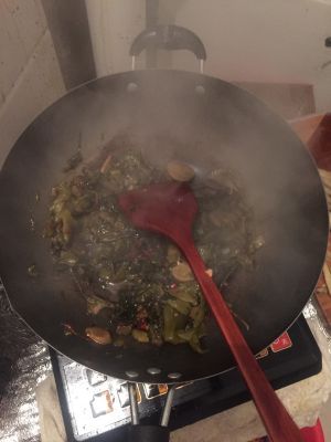 锅中倒油(油多少呢大约汤勺一勺吧个人觉得油多点香)油热后将酸菜包打开倒入,翻炒一下