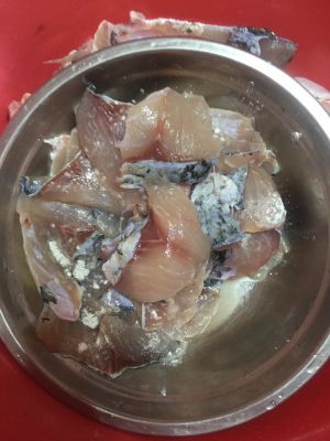 先把鱼切成片状 然后用清水冲洗几遍 沥干