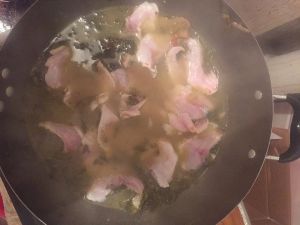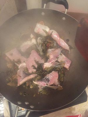 开火 锅中放蒜片 姜片爆香 放入鱼骨煎一会 加入豆瓣酱 酸菜炒3分钟 放点料酒 加清水没过鱼骨的两倍