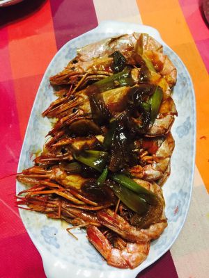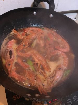 油锅内放入姜片和葱段,然后放入大红虾翻炒一下加入提前调好的醋,生抽,白糖,料酒混合汁,并加入可以没过红虾的热水。再加入适量的盐,调制炖煮中火炖。