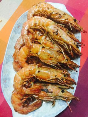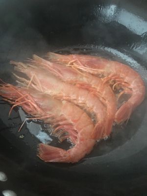 起锅入油,放入大虾。使虾两面沾油。炒至金黄色出锅。