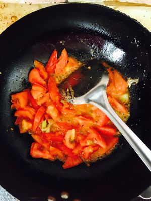 1锅中放入油,葱蒜翻炒几下就可以了 2放入西红柿翻炒出汤(如图) 3倒入鸡蛋翻炒,放入盐翻炒 4翻炒几下后,出锅